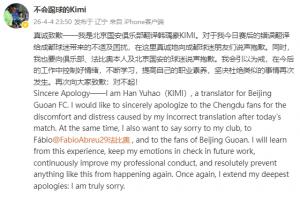 Sincere Apology——I am Han Yuhao(KIMI), a translator for Beijing Guoan FC. I would like to sincerely apologize to the Chengdu fans for the discomfort and distress caused by my incorrect translation after today's match. At the same time, I also want to say sorry to my club, to Fábio@法比奥 , and to the fans of Beijing Guoan. I will learn from this experience, keep my emotions in check in future work, continuously improve my professional conduct, and resolutely prevent anything like this from happening again. Once again, I extend my deepest apologies: I am truly sorry.
