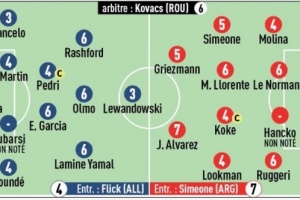 巴萨:霍安·加西亚(5分)、马丁(4分)、孔德(4分)、佩德里(4分)、埃里克·加西亚(6分)、奥尔莫(6分)、拉什福德(6分)