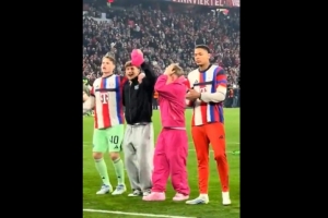 卡尔因伤缺席此役,赛后他与拜仁队友一起庆祝晋级,这位小将穿着一身粉色衣服,在球员之中格外显眼,他的帽子还被比朔夫抢走。